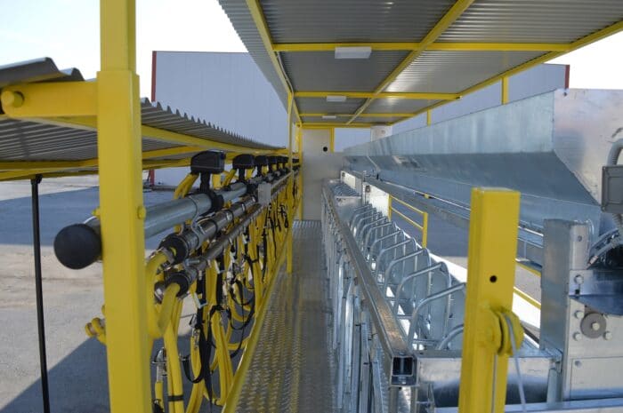 - Revêtement de sol : La plateforme mobile est équipée d’un sol en aluminium robuste, à la fois durable et facile à nettoyer, garantissant des conditions de traite hygiéniques pour vos animaux.