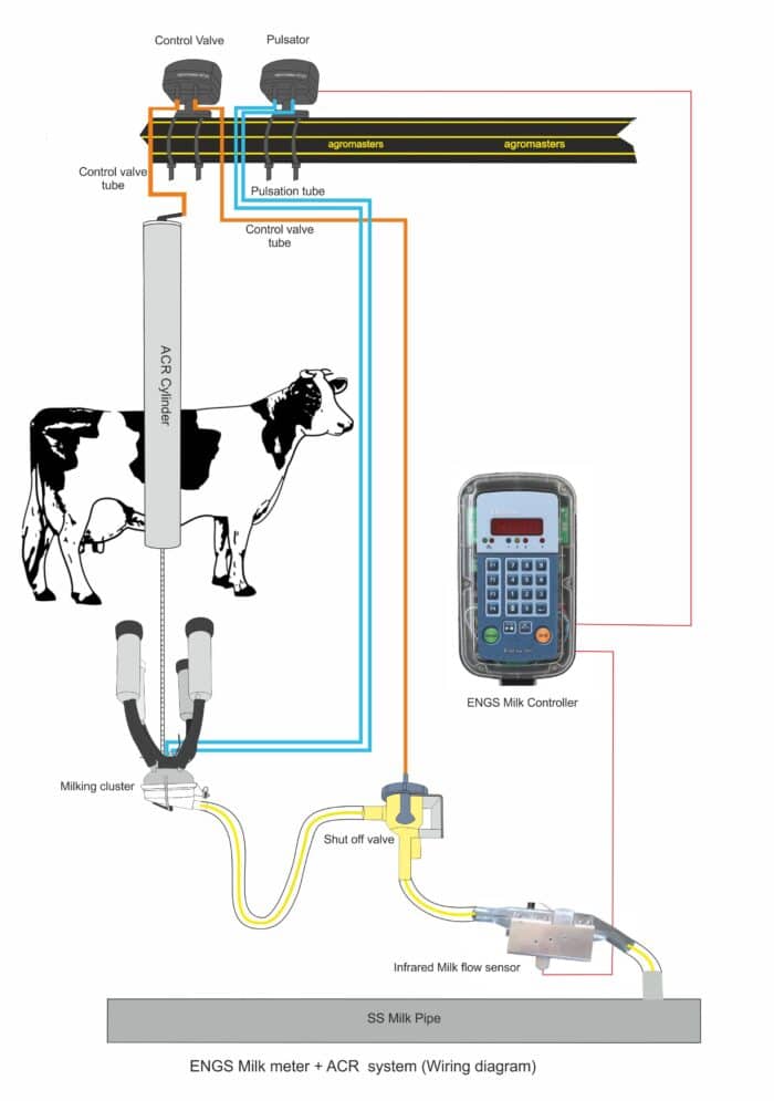 Индикатор удоя контролирует процесс доения для каждой коровы, овцы или козы, как автоматически, так и вручную. Он состоит из: а) водонепроницаемого прозрачного пластикового корпуса, содержащего электронную плату, и б) легкого в использовании мембранного клавишного блока.