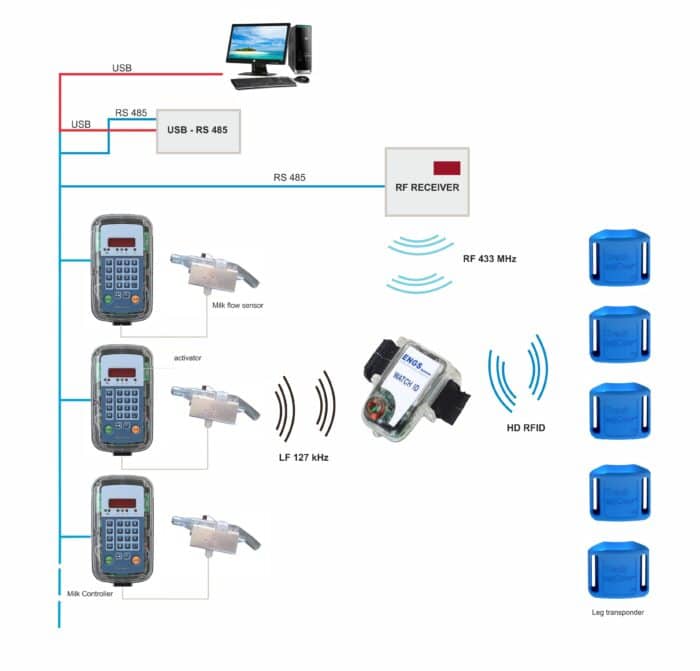 Этот приемник затем передает данные на компьютер управления, который сопоставляет номер бирки с номером животного и передает информацию на дисплей контроллера на том посту. Таким образом, результаты доения связаны с этим животным в контроллере точки доения.